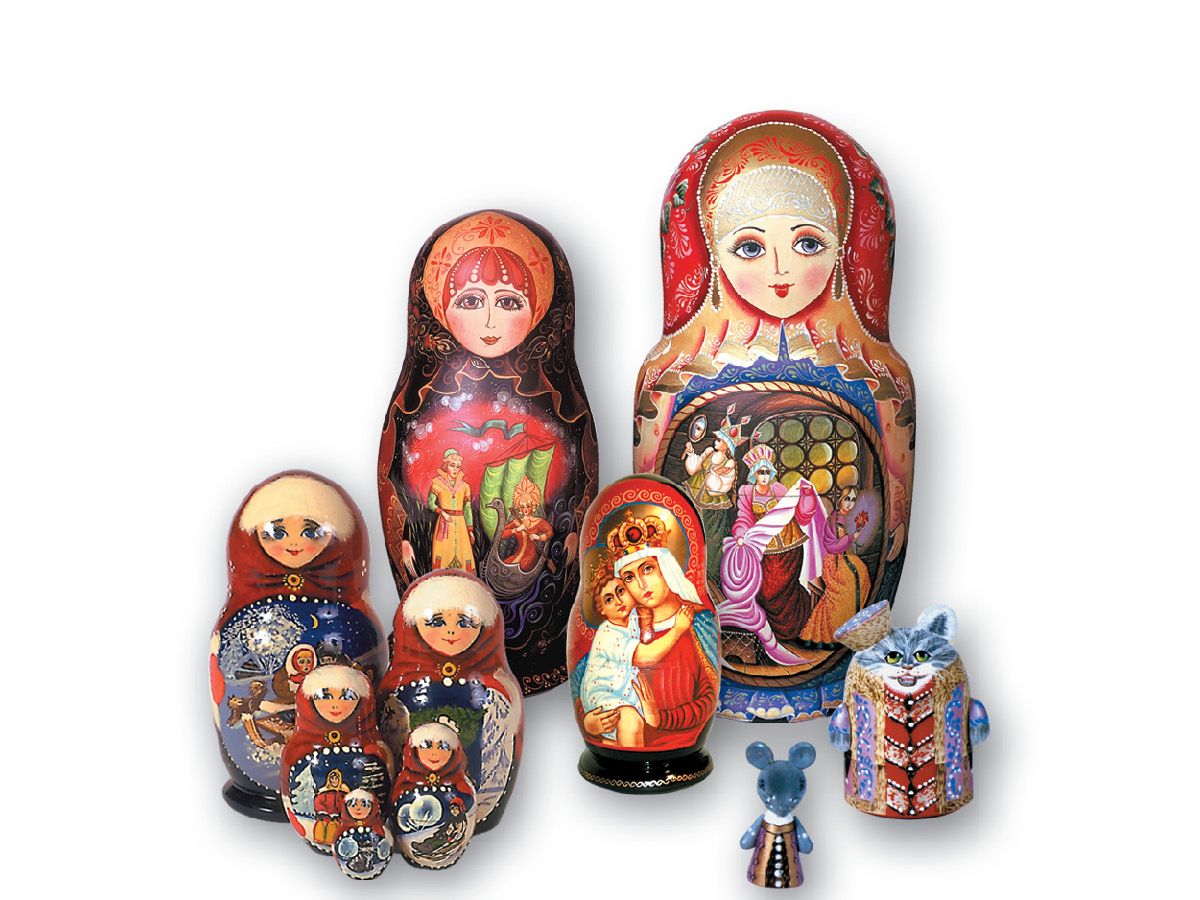 Classic Russian Dolls range from the tradition of Russian folk art encompassing a wide range of Floral, inspirational Folk Tales and the symbolism of strength and unity in Family Dolls.